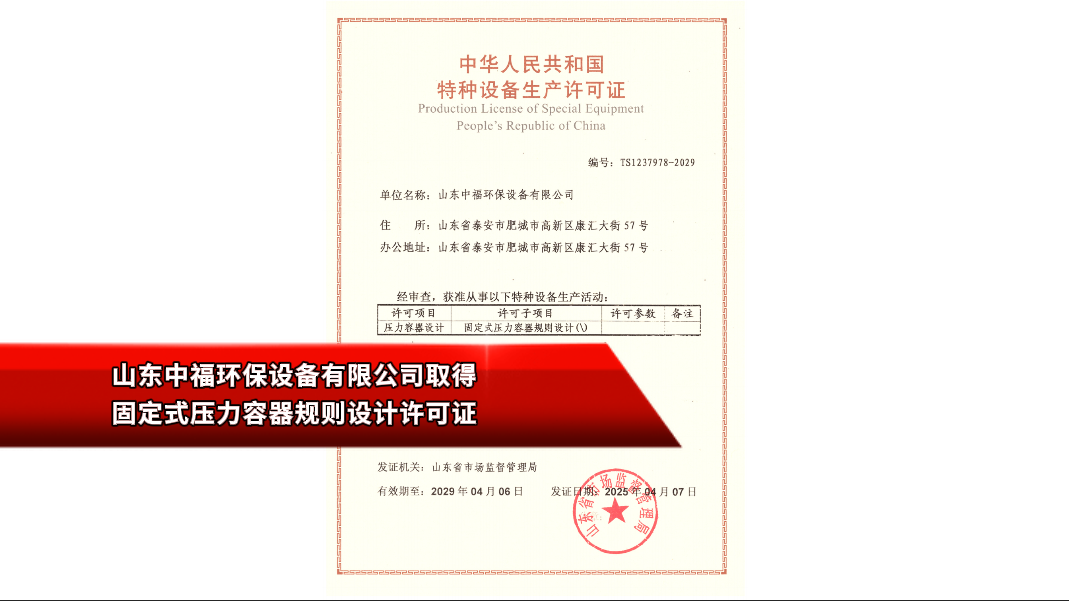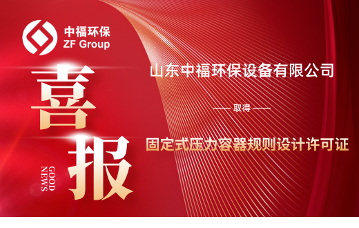山東中福環(huán)保設(shè)備有限公司取得固定式壓力容器規(guī)則設(shè)計許可證