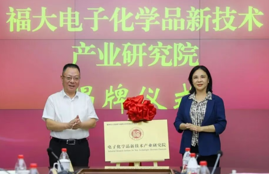 隨后,吳明紅與高雙成共同為電子化學(xué)品新技術(shù)產(chǎn)業(yè)研究院揭牌。該研究院將依托福州大學(xué)的科研與人才優(yōu)勢(shì),聚焦?jié)耠娮踊瘜W(xué)品、光刻膠樹(shù)脂與單體、電子特氣等前沿領(lǐng)域,建設(shè)“研究院+中試基地+產(chǎn)業(yè)園”創(chuàng)新聯(lián)合體,開(kāi)展基礎(chǔ)研究、應(yīng)用技術(shù)攻關(guān)和高端人才培養(yǎng)。